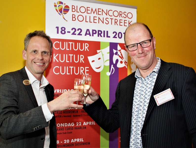 Bart Siemerink directeur Keukenhof en Gerrit Rutgrink voorzitter Bloemencorso in het Oranje Nassau Paviljoen 10-4-18